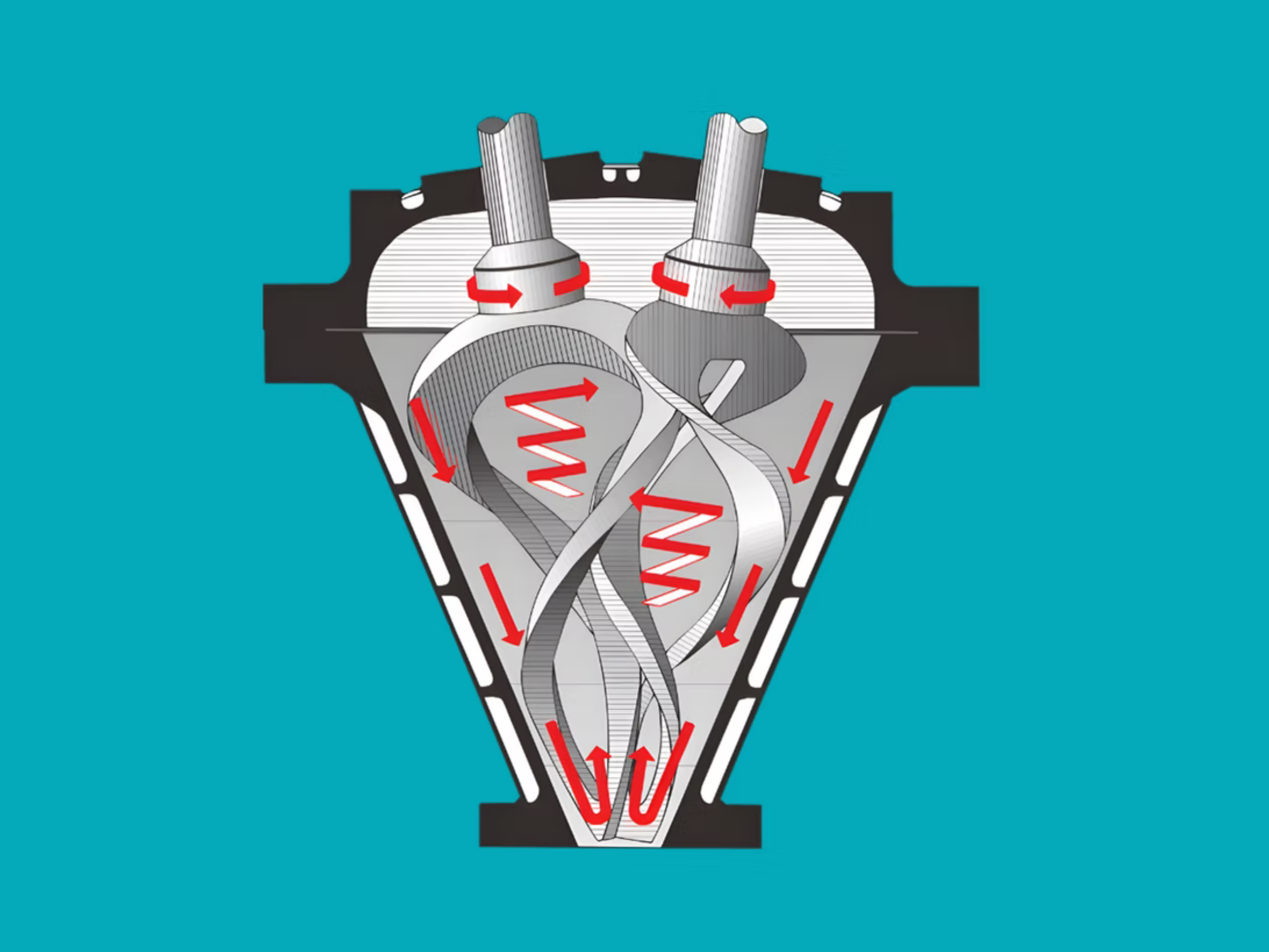 搅拌器具有两个相互啮合的螺旋锥形叶片,它们在带夹套的锥形容器内旋转。