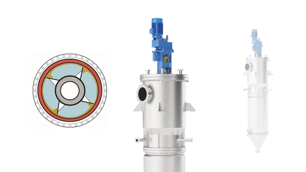 高沸点组分沿壳壁流动,并从产品出口排出。刮板的作用对于促进向下流动非常重要。产品/浓缩物在操作温度下应为流体形式。根据产品、其粘度和工艺压力,可提供不同设计的转子。