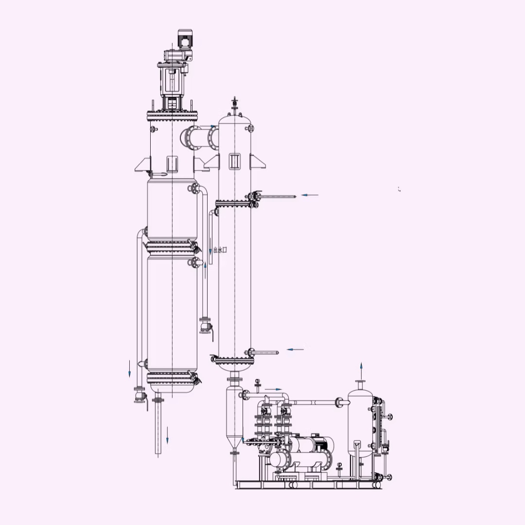 原料从装置顶部引入,并通过旋转的分布盘铺展在壳体的内表面上。特殊设计的刮板刮擦原料,从而形成并更新液膜。即使对于高粘度流体,这种薄膜也能实现高效的传热。低沸点组分蒸发并通过一个捕雾器。这最大限度地减少了液体液滴随蒸汽的夹带。蒸汽通过蒸汽管线输送到外部冷凝器(可选)并冷凝。对于需要低压降的特定应用,蒸发器的中心部分装有冷凝器,从而使该装置成为短程/分子蒸馏装置。在这种情况下,蒸汽在管束外侧冷凝,并通过位于中心的冷凝液出口流出蒸发器。
