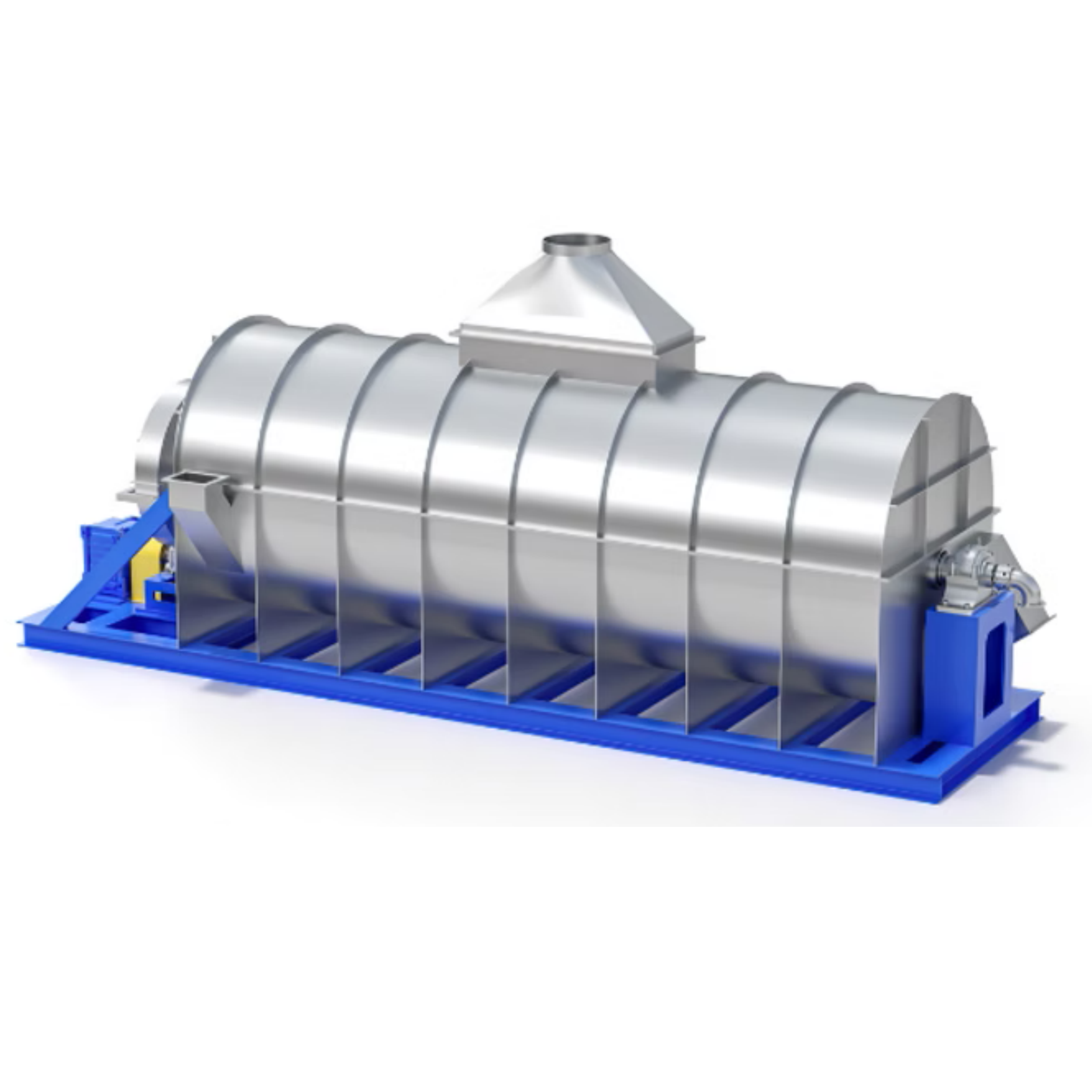 蒸汽加热的管束在固定的外壳内缓慢旋转,并将待干燥的产品轴向输送通过干燥机。铲子沿外壳的圆周输送产品,每次旋转时产品都会穿过加热的管束落下。